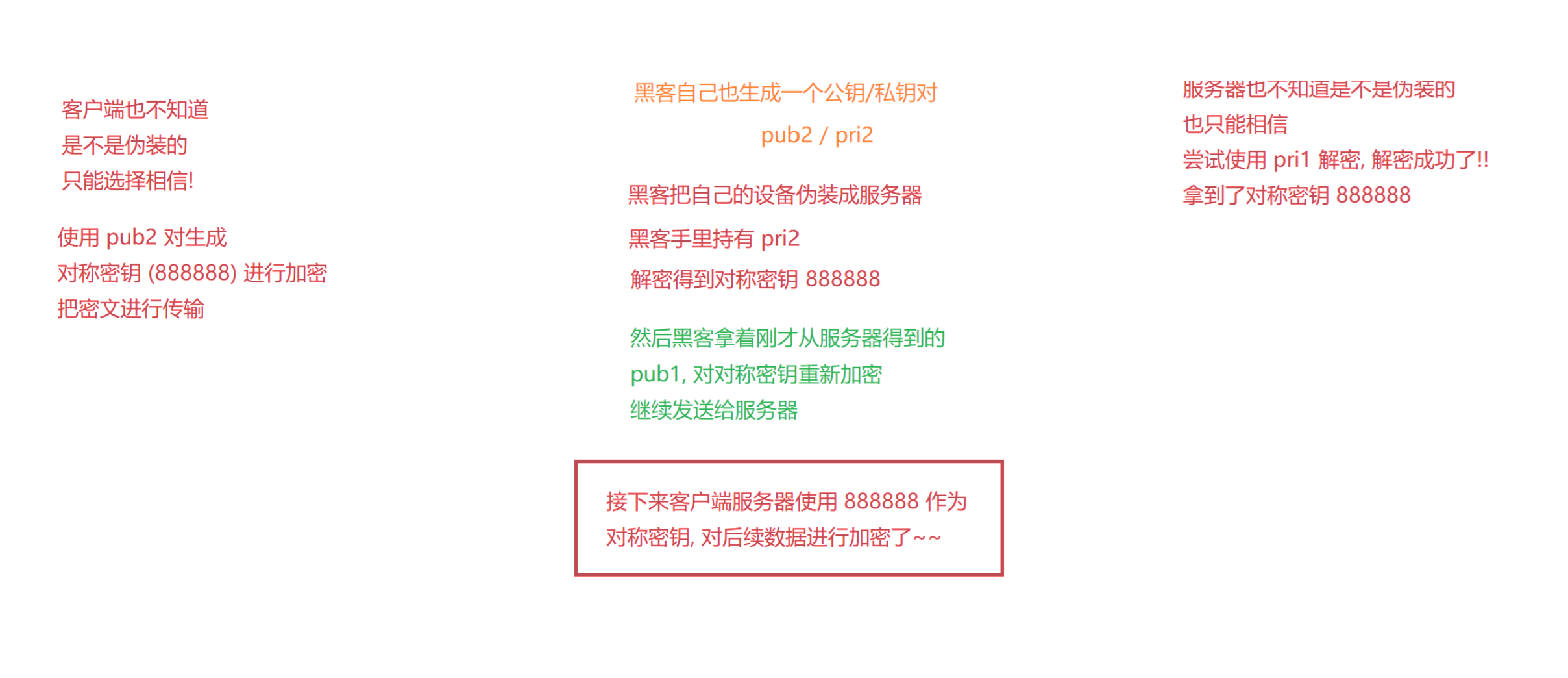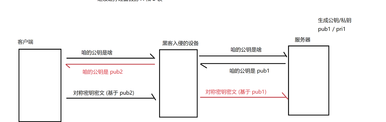 - 这个时候黑客入侵的网络设备伪装成服务器给客户端pub2公钥,客户端也无法判断他到底是不是服务器的,就直接相信了,之后传输对称公钥就使用pub2公钥进行加密传输, 那么被黑客入侵的网络设备那里就要pri2可以解密pub2密文,这个时候就知道了我们后续传输使用的对称公钥。后续采用对称加密传输的时候就可以直接解密拿到明文数据了。对于这种攻击方式,叫做中间人攻击,服务器和客户端都无法识别对方的身份,直接无条件信任导致被欺骗