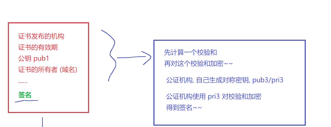 - 证书又是如何来验证数据的呢?通过计算证书的字段得出检验和,然后用我们公证机构的pri3私钥进行加密就得到了数字签名