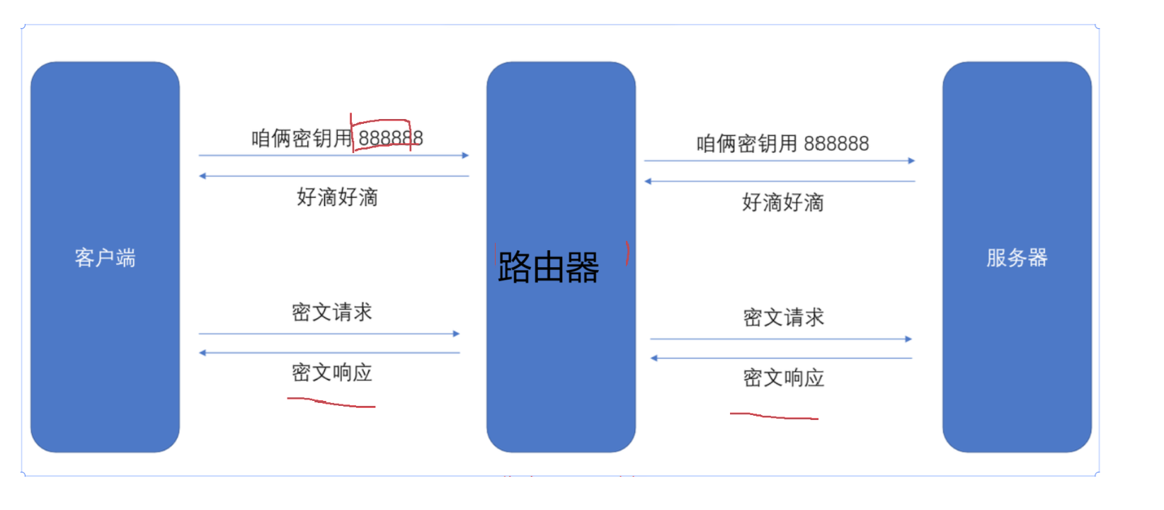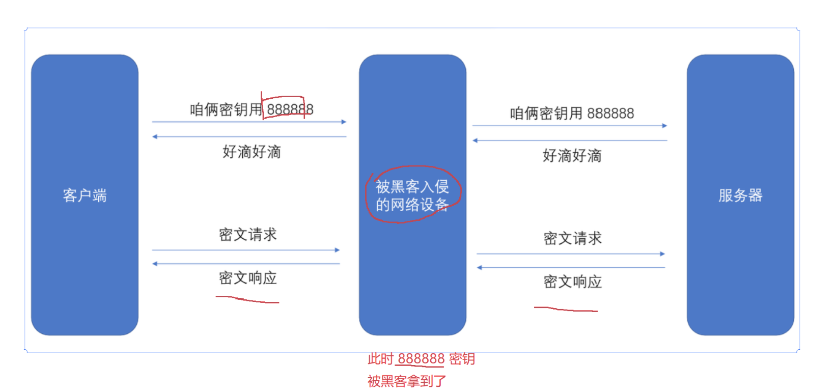 - 这里看似是安全了后面可以直接用密文传输,但是如果我们黑客把网络设备(这里是路由器)入侵了,通过网络设备抓包到了我们传输的数据那么我们之前明文传输的密钥不就让黑客知道了吗,这个时候黑客也拿到了这个密钥,那么后续传输的密文都可以用这个密钥来解密,这不相当于是没有加密吗?