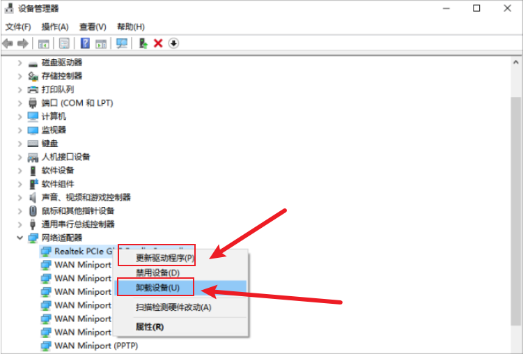 (3)右键网卡选择 "卸载设备",然后重启电脑,系统会自动重装驱动。