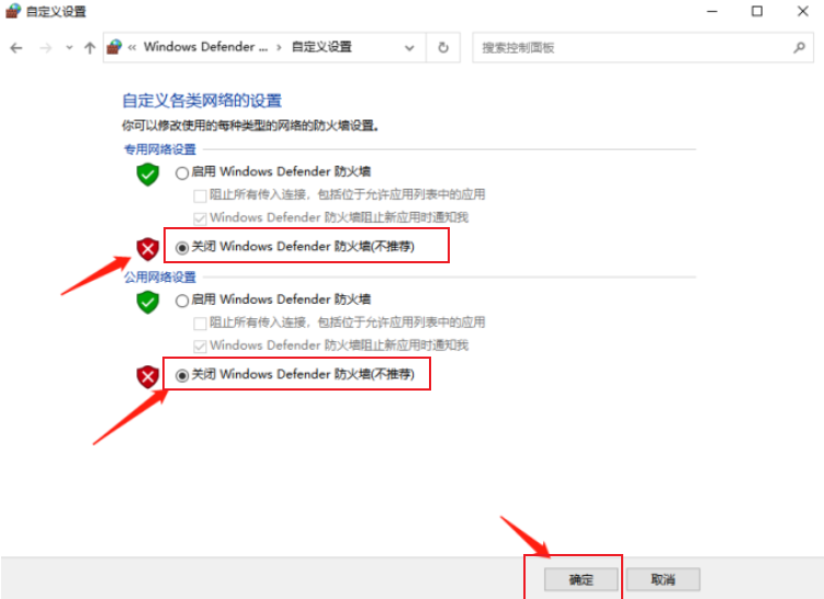 (2)点击 "启用或关闭 Windows Defender 防火墙",选择 "关闭"(两个网络都关),保存设置
