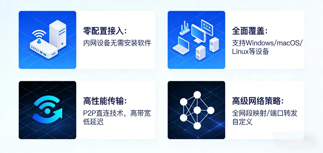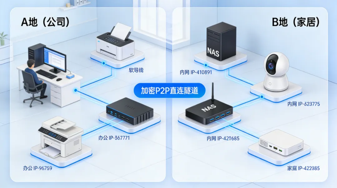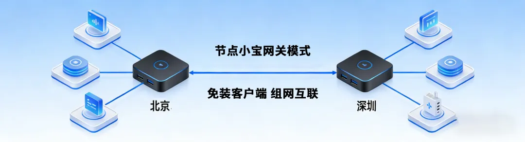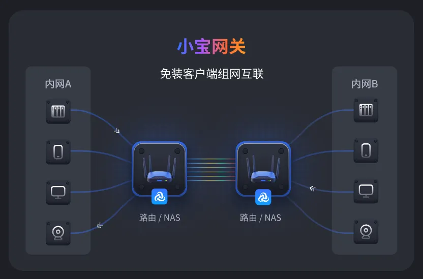 节点小宝的网关模式核心在于智能路由技术。它通过建立P2P直连通道,实现不同局域网设备的直接通信。适合多设备的小伙伴们,用NAS/或路由器作为两端设备,其下内网设备均无需安装客户端均可穿透访问。