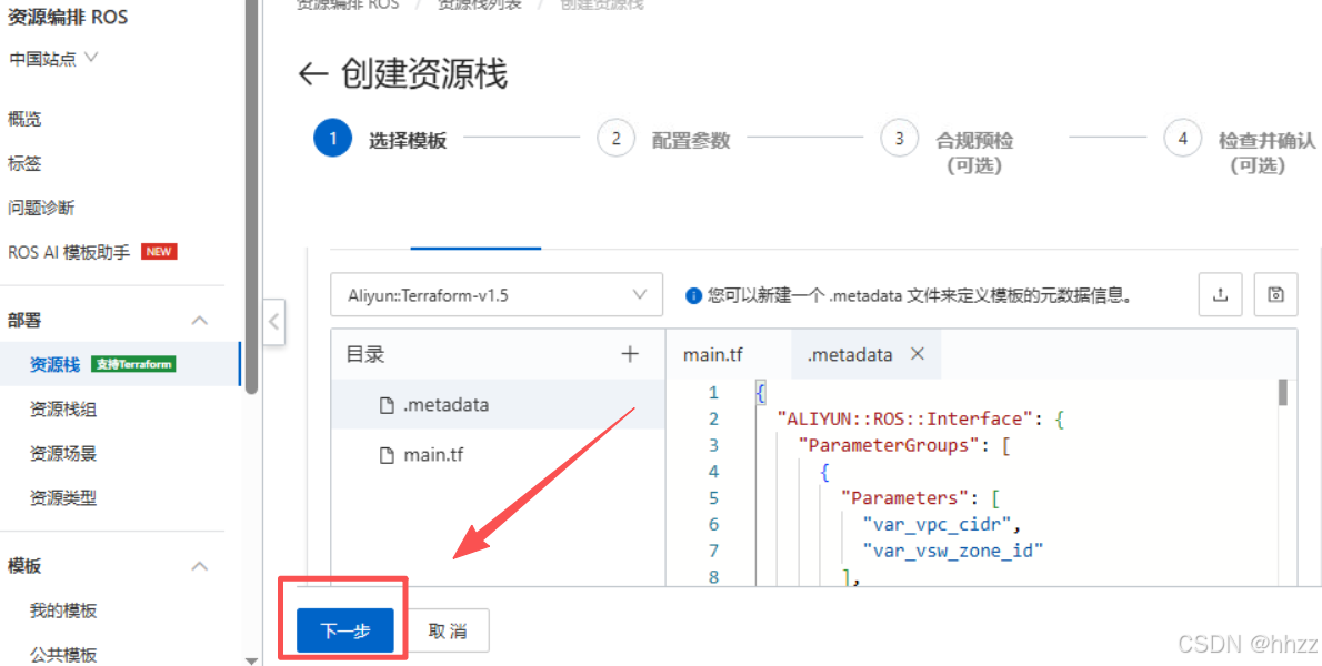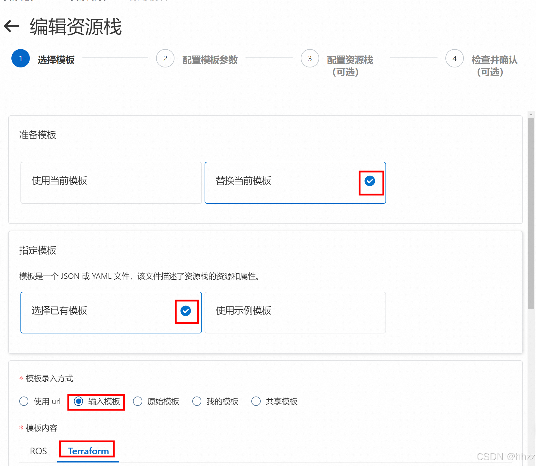 接下来创建资源模板,在创建资源栈页面中,依次点击如下选项,选择已有模板,输入模板,Terraform。
