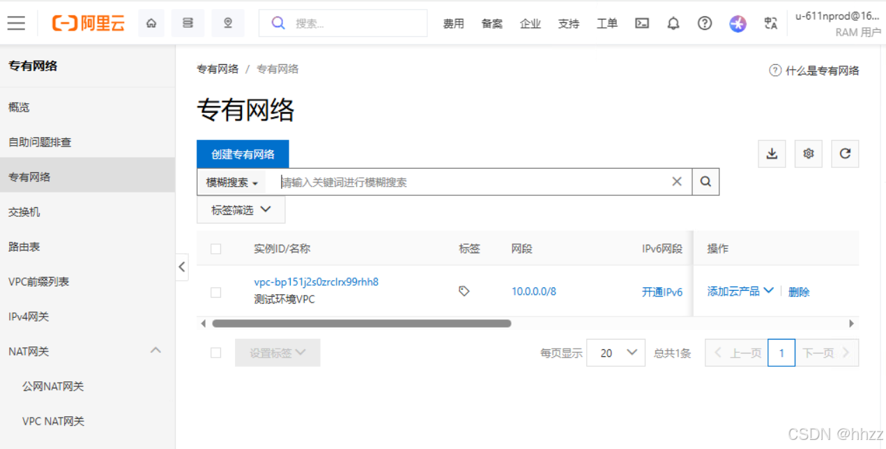 - 在杭州地域创建1个VPC,VPC的CIDR可以在10.0.0.0/8,172.16.0.0/12,192.168.0.0/16 中选择