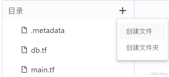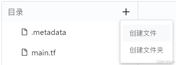 - 修改完 main.tf 之后,创建和编辑模板中的配置文件 .metadata 。点击目录右侧的+按钮,并点击创建文件按钮。