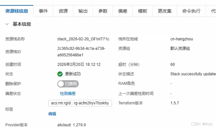 等待一段时间之后,资源栈信息中的状态栏,会显示创建成功。这时云上资源就已经创建完毕了