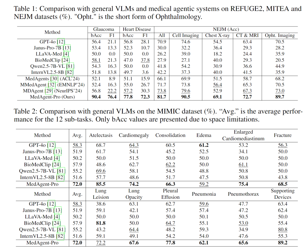 对比现有医疗智能体:在REFUGE2、MITEA、NEJM等数据集上,全面超越MedAgents、MMedAgent等系统,解决了这类模型无法处理复杂多模态诊断的问题;