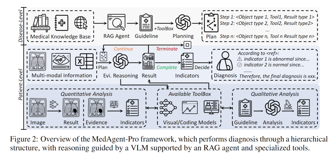为了让AI复刻医生的临床诊断逻辑,研究团队提出的MedAgent-Pro打造了分层级的推理工作流,核心是"疾病层面标准化规划+患者层面个性化推理",并融入检索增强、定量分析、证据验证三大关键设计,让每一步诊断都有依据、可验证。