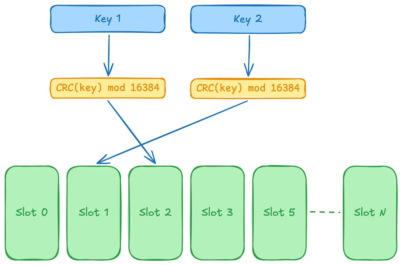 它将整个哈希值空间划分为 16384 个槽位,每个节点负责一部分槽,数据通过 CRC16 算法计算后对 16384 取模,确定它属于哪个槽。