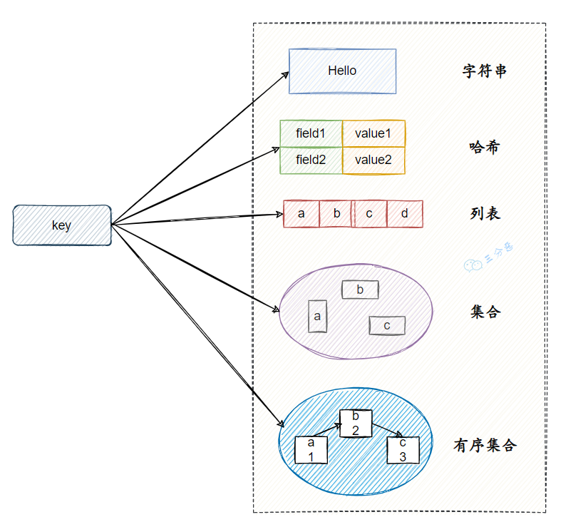 有5种基本数据类型:字符串、列表、哈希、集合、有序集合。3种扩展的数据类型:用于位操作的Bitmap、用于基数估计的HyperLogLog、支持存储和查询地理坐标的GEO。(这里说的类型就是键值对中值Value的类型,其中key的类型永远都是String)