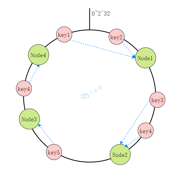 想象一条闭合的环(Ring),在这个环上定义了 0 到 2^32−1个点。
