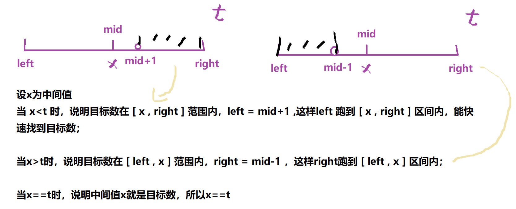 left=mid+1;//如果小于,让left跑到mid+1的位置,变成[mid+1,target]