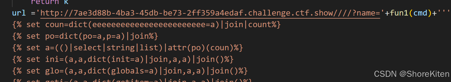 功能:把字符串 s 里的每个字符转成 ASCII 码,生成 Jinja2 模板里定义数字变量的代码