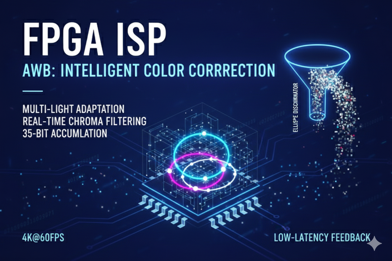 自动白平衡 AWB 是 ISP 系统中最具挑战性的环节之一。它将解析几何(椭圆判定) 、统计学 与FPGA 高速流水线架构完美结合。理解了这套筛选与累加的机制,你就掌握了商用 ISP 色彩管理的核心密码。