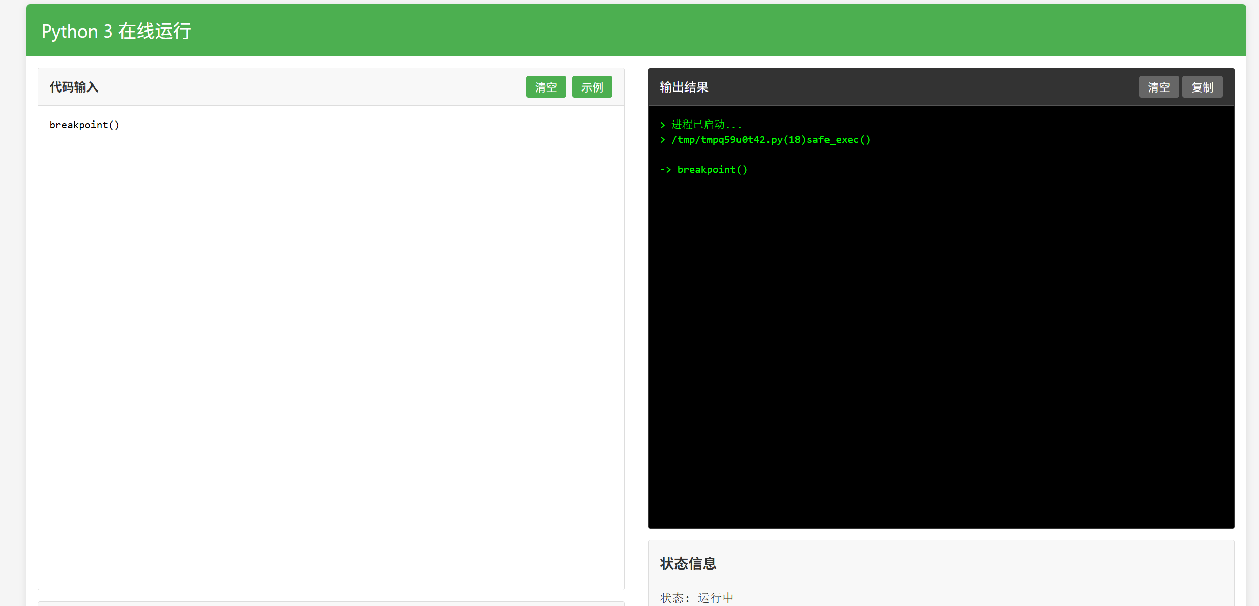 res = requests.post(f"{TARGET_URL}/api/run", json={"code": "breakpoint()", "args": ""})