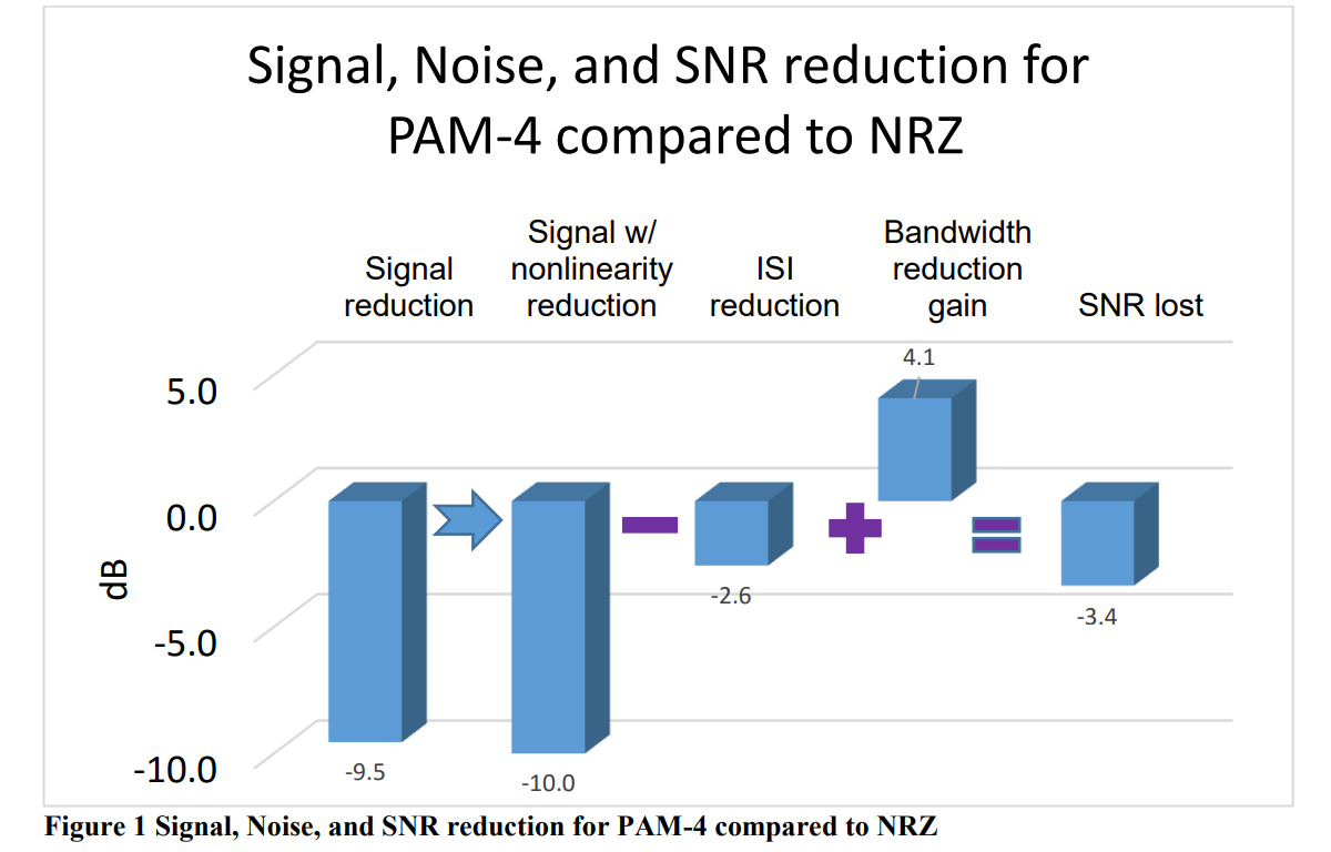 非线性效应可能使信号再降低约5%。综合这些因素,如下图所示,PAM-4的回波损耗比NRZ严重约3.4 dB。