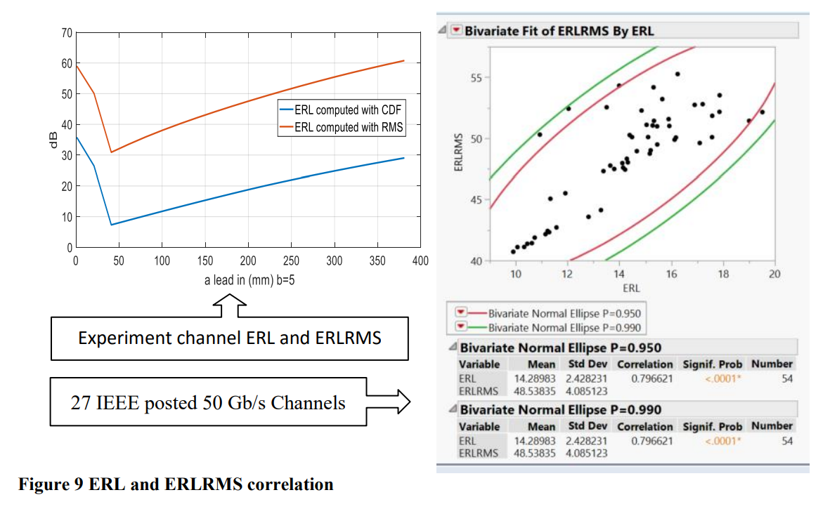 ERLRMS的计算比使用CDF和卷积计算的ERL简单得多。在本实验中,ERLRMS和ERL的跟踪效果相当好,如图9左侧图表所示。然而,对于更复杂的27个IEEE 50 Gb/s信道,其相关性不如右侧相关图所示的那样好。