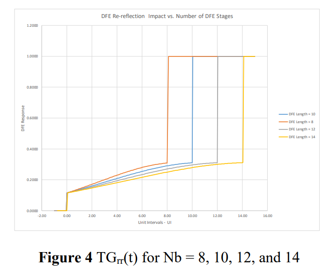 系统架构中判决反馈均衡器(DFE)的存在会改变反射的影响。DFE可在一定数量的单位间隔(NbUI)范围内补偿接收端输入端口处的反射。但DFE不会消除接收端输入端口处的物理反射,信号可能再次反射回发送端,并与其他反射元件相互作用。时域门控加权因子TGrr(t)可用于消除DFE范围内(NbUI内)的反射,并用于调整器件、信道或被测组件的反射脉冲(PTDR)。