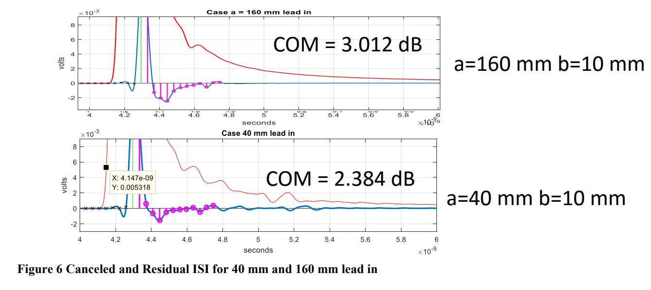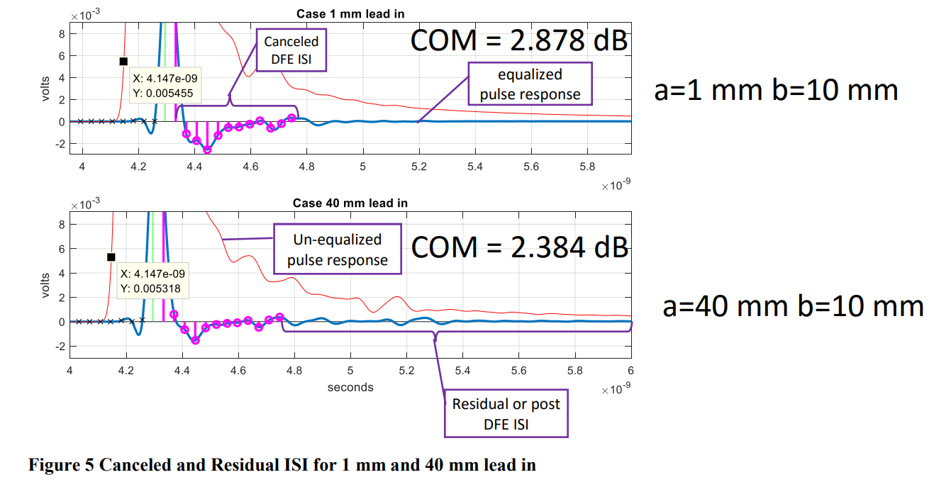 脉冲响应可以揭示反射是如何被接收的。图5展示了实验中的两种情况:上图是引入段"a"距离封装1 mm的情况,下图是"a"为40 mm(在时间上等于DFE长度)的情况。两个反射点之间的距离设为10 mm,小于DFE对应的时间。注意到当a=1 mm时,DFE的抵消效果比a=40 mm时更显著,但COM性能更好。而a=40 mm的情况会引发更多的再反射。