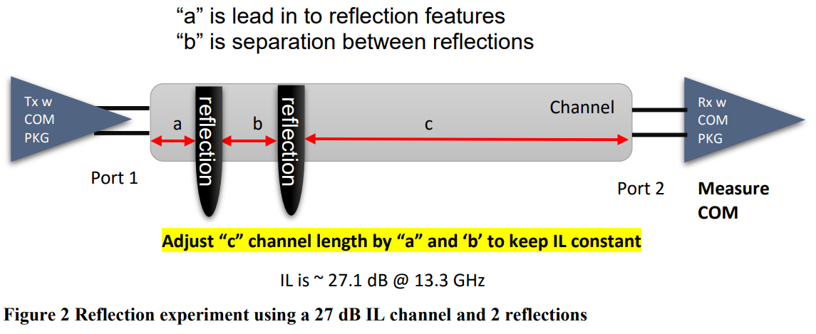 此外还需要考虑一个事实:插入损耗(Insertion Loss)的存在会抑制反射信号。一旦计入插入损耗,观测到反射更小的器件,反而可能具有更低的信噪比(SNR)。这一点在使用参考 COM 封装的 COM 结果中得到了验证。该封装在两段(12 mm 和 30 mm)中等损耗传输线的两侧各接入一个电容,因此需要分别指定短封装与长封装。结果表明,对于 50 Gb/s PAM‑4 背板及芯片间信号,长封装的反射时延接近 Nb・UI。