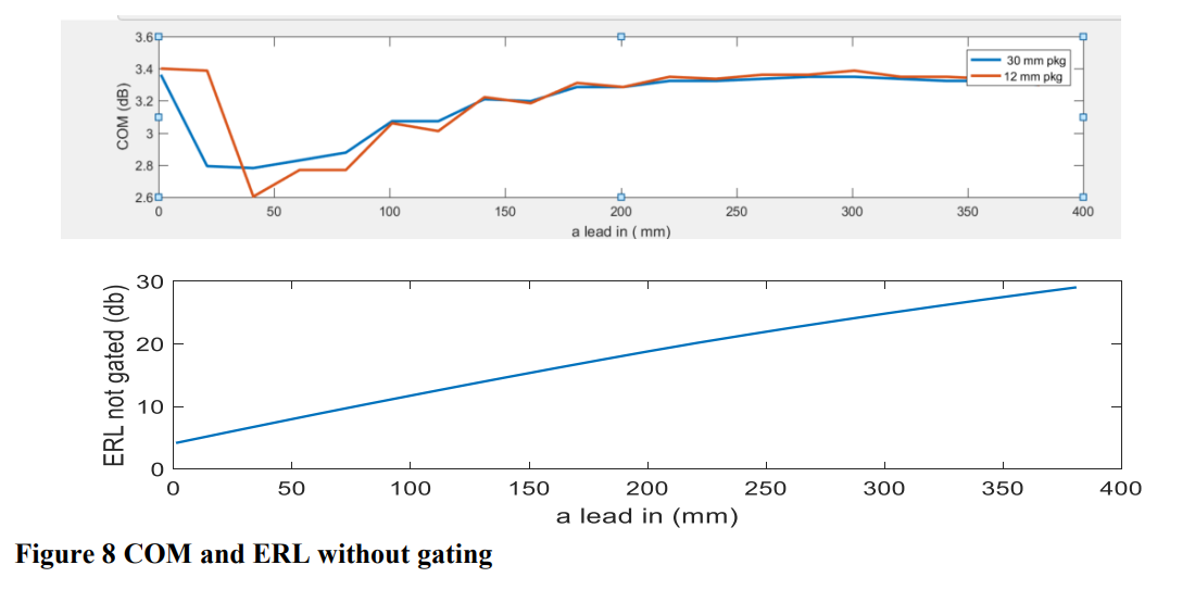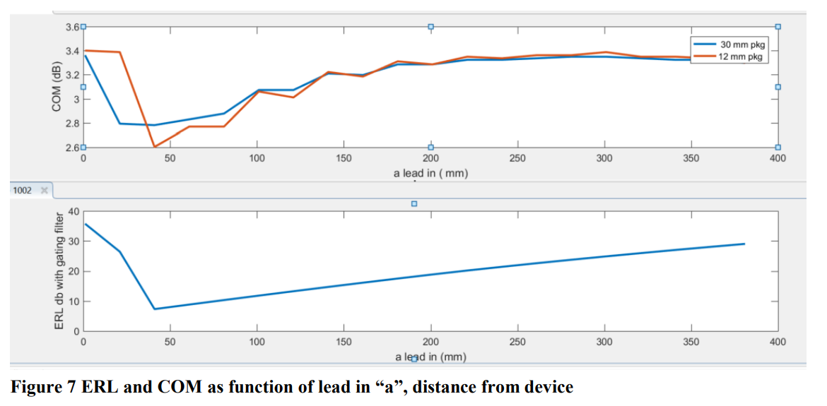 另一项实验得出了一些有趣的结果。在这个版本的实验中,引入段"a"可以扫过信道的整个长度。图10所示的COM结果表明,放置在器件发送端或接收端附近的反射对性能的影响相似。与之前一样,当反射距离器件20 mm以内时,COM性能明显保持恒定。在这两种情况下,可以注意到在40 mm处COM的平均值开始增加。这表明ERL的门控加权函数可能是有效的。