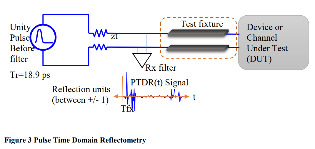 图3展示了脉冲时域反射计(PTDR)的原理,它仅是使用脉冲作为源的时域反射计。可选择使用测试夹具来替代去嵌操作,但本实验未使用测试夹具。Tfx表示信号从测试夹具末端输出所需的时间,在本文中设为零。TDR源采用高斯脉冲(20%-80%上升时间)Tr=18.9 ps。接收端滤波器采用50 Gb/s背板和线缆COM计算中使用的巴特沃斯滤波器。