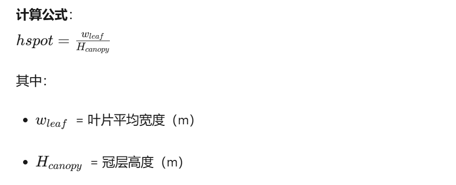 | hspot (q) | 热点参数 | 无量纲 | 0 - 1(通常0.01-0.5) | 叶片宽度/冠层高度比,农田常用0.05-0.2 |