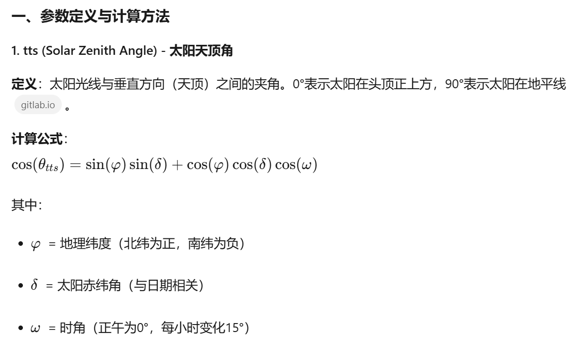 | tts (sza/θt) | 太阳天顶角 | 度 | 0 - 90 | 0°=太阳垂直头顶,90°=地平线 |