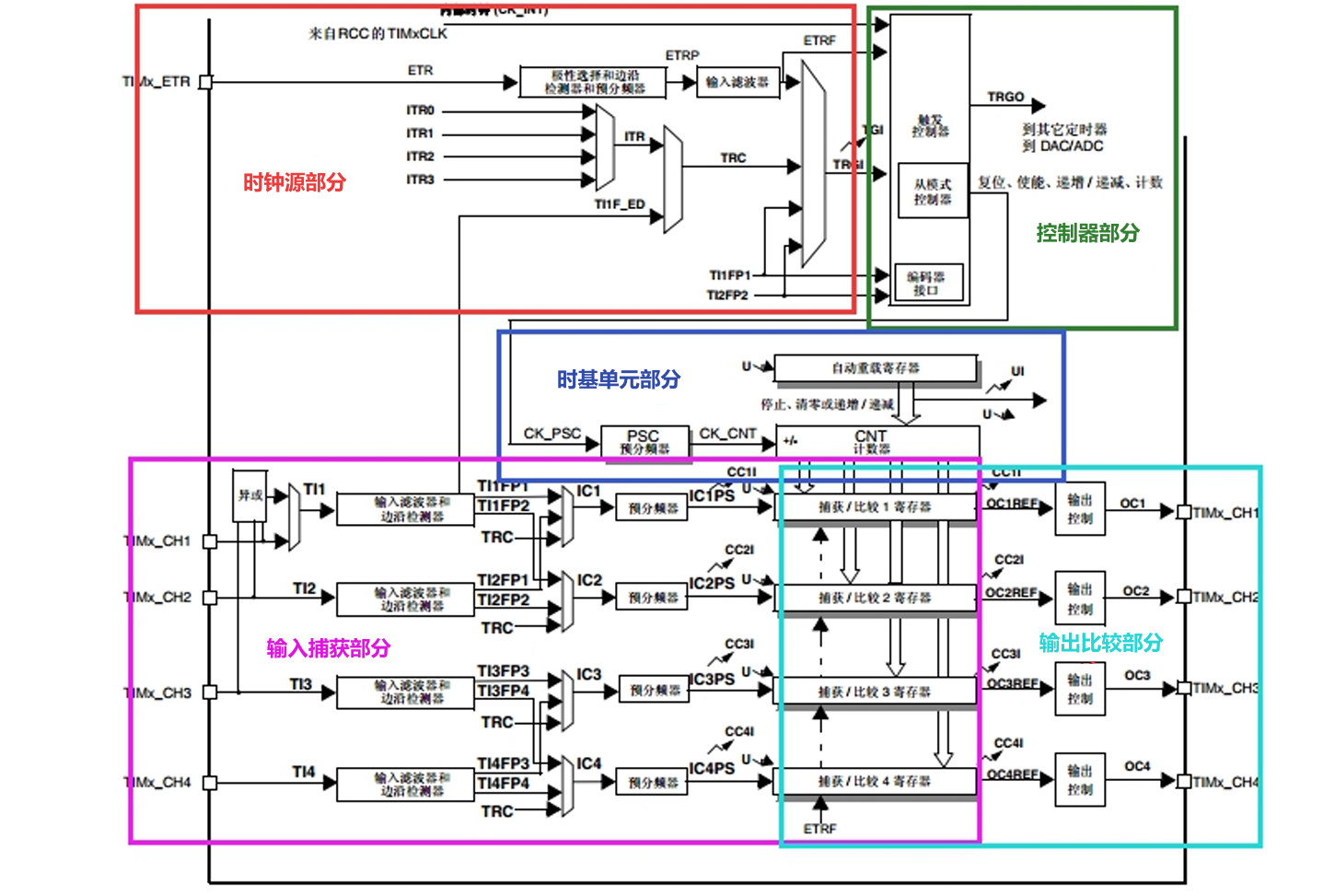 STM32 通用定时器(如 TIM2-TIM5)的结构框图如下所示,图中标示的"输出比较部分"即为通用定时器的输出比较模块电路,包含 4 个独立的输出比较通道,它们共用同一个计数器,但每个通道都有独立的 CCR 寄存器和输出引脚。