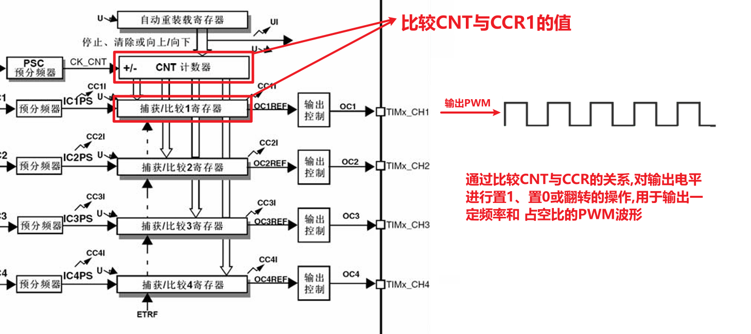 这个比较结果是生成 PWM 信号的原始依据。CCR 的值决定了电平翻转的时间点,也就是最终波形的占空比。