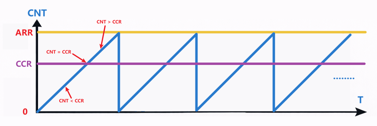 在 CNT 运行过程中,硬件电路会实时比较 CNT (当前计数值)与 CCR(预设比较值)的大小。比较结果通常分为三种情况:
