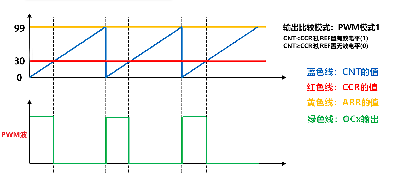 通俗地说,输出比较就像给定时器设置了一个"闹钟":当计数器走到我设定的数值(CCR)时,引脚就自动执行一个动作(比如翻转电平、输出高电平或低电平)。这种自动化的硬件机制,使得生成精确的PWM波形变得简单高效。