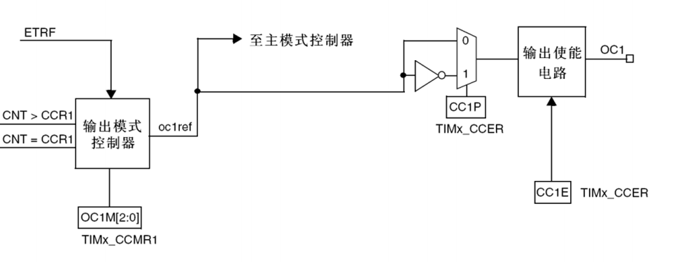 比较结果出来后,并不是直接输出到引脚,而是先送入"输出模式控制器"。根据寄存器 TIMx_CCMRx 中 OCxM 位的配置(如 PWM 模式 1、PWM 模式 2、翻转模式等),生成一个中间参考信号 OCxREF (Output Compare Reference)。如图所示: