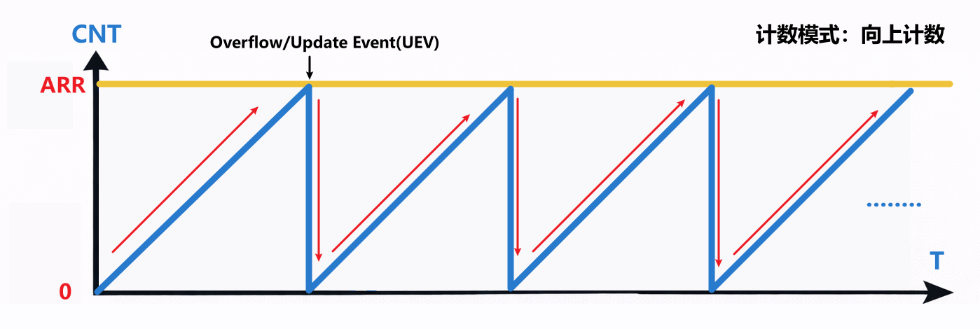 - 向上计数模式:CNT 从 0 递增至自动重装载值(ARR),发生溢出后清零,循环往复。这是生成 PWM 最常用的模式。如下图所示: