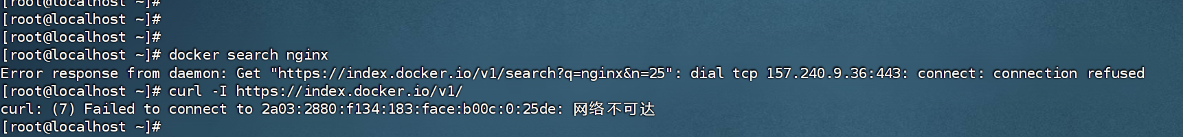 结果 :配置已生效,但 docker search nginx 仍然连接被拒绝。