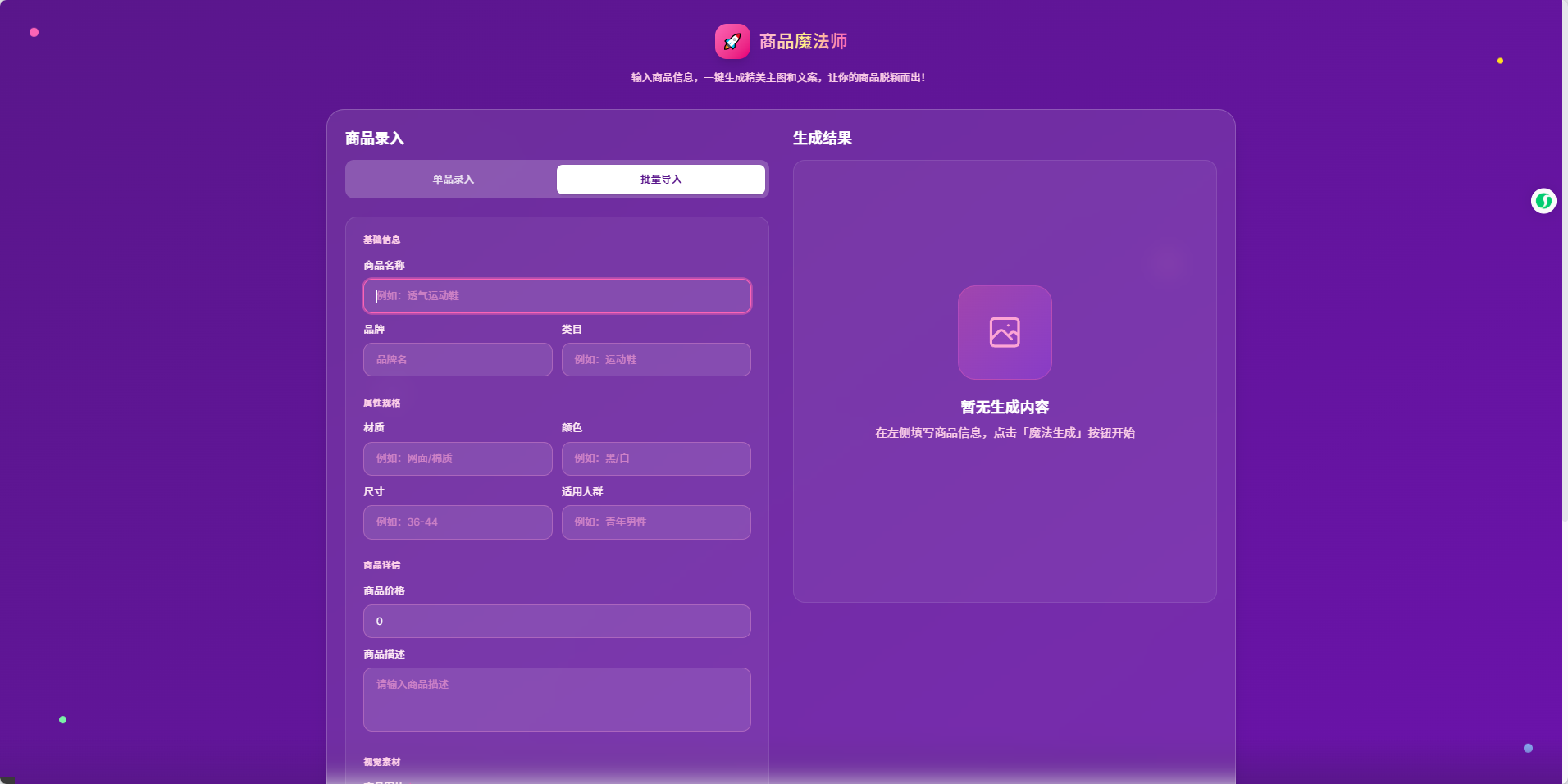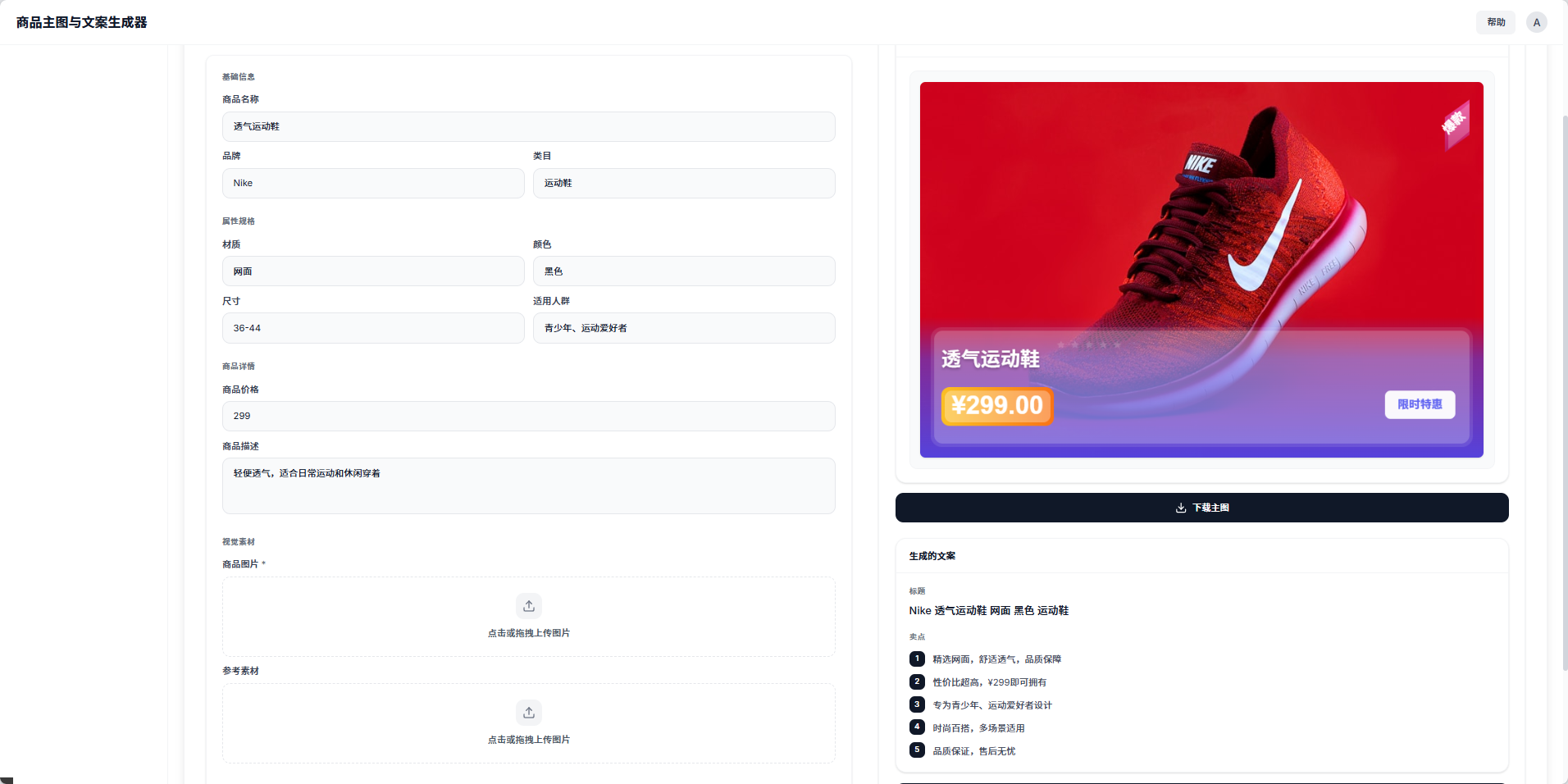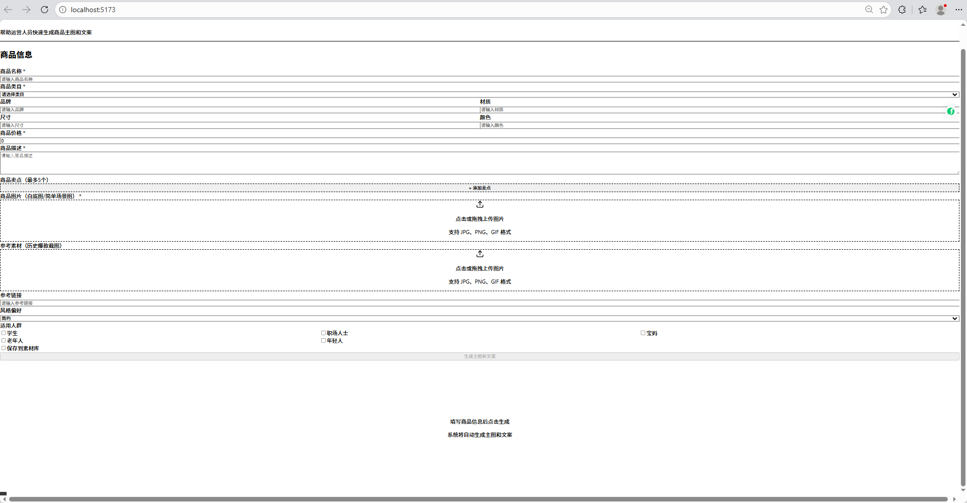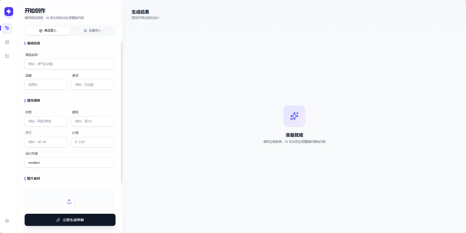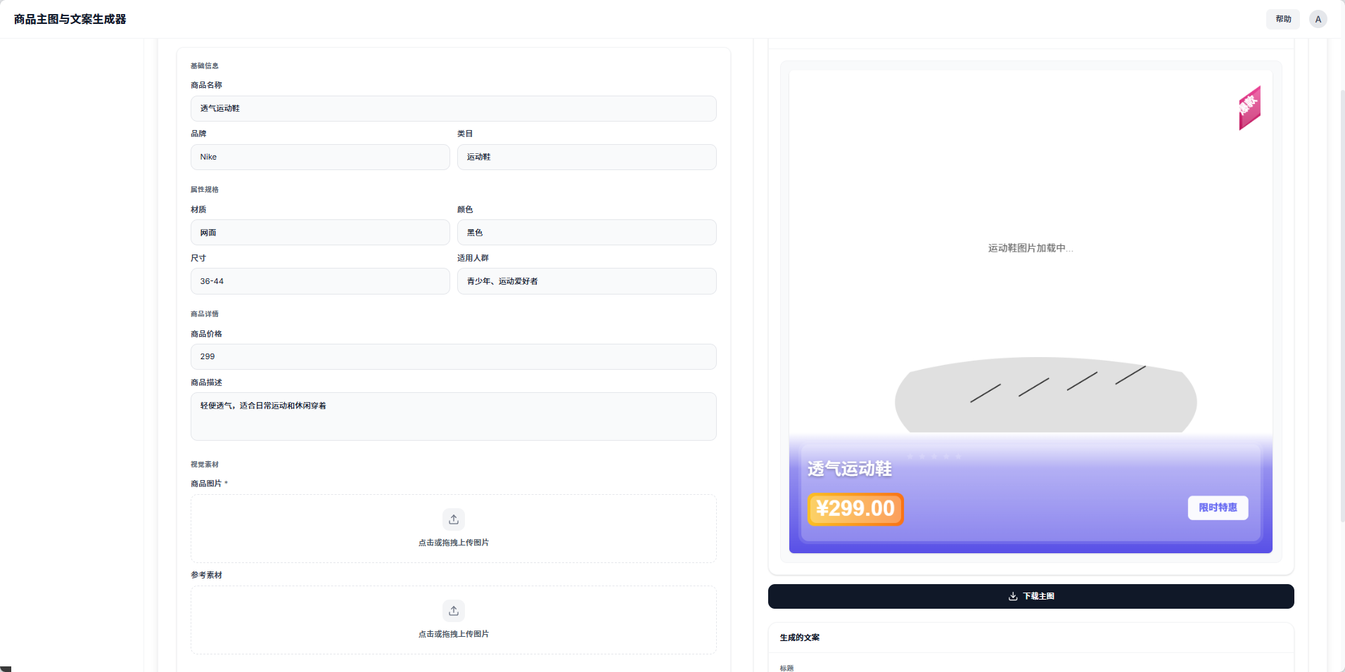 创建一个单页面应用,帮助电商运营人员自动生成商品的主图和文案。用户可以在左侧填写商品信息,右侧实时预览生成的结果。支持素材库本地存储功能。