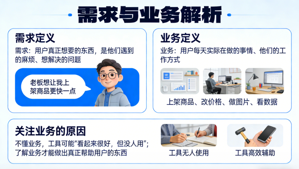 小明横向切分后发现,金融分析师这个人群有特殊需求:他们需要追踪特定行业动态,但信息太分散。纵向深挖他们的场景:早上看 overnight 美股动态、汇率变化;上午追踪持仓公司的公告、行业新闻;下午研究潜在投资标的,需要大量行业信息。
