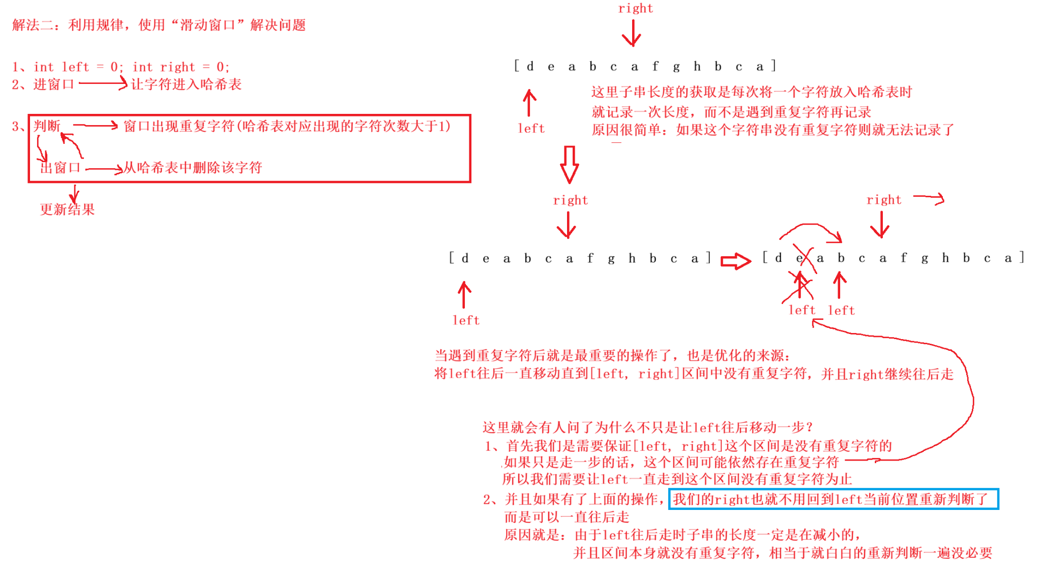 - 如果这个字符出现的频次超过 1 ,说明窗口内有重复元素 ,那么就从左侧开始划出窗口 ,直到 s[ right ] 这个元素的频次变为1,然后再更新结果。