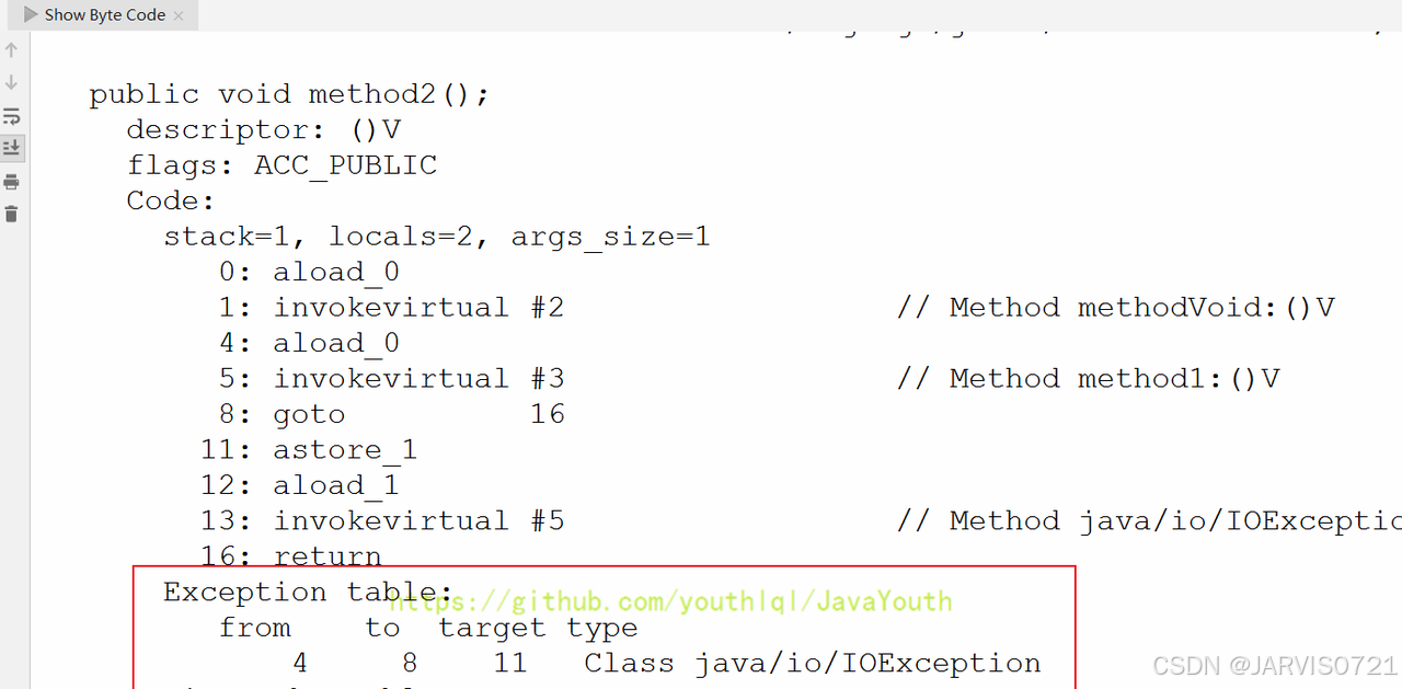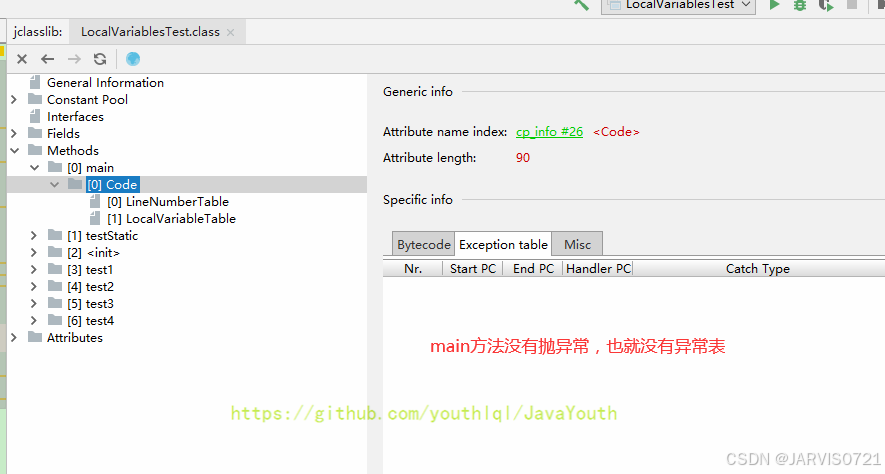 方法执行过程当中,trycatchfinally代码块/syncronized捕获的异常类型存储在异常表当中,也就是一张用于指示异常处理的规则表。"万一发生这种异常,请按照这张表导航"(异常表大小固定,与抛出异常数量无关,编译期生成)