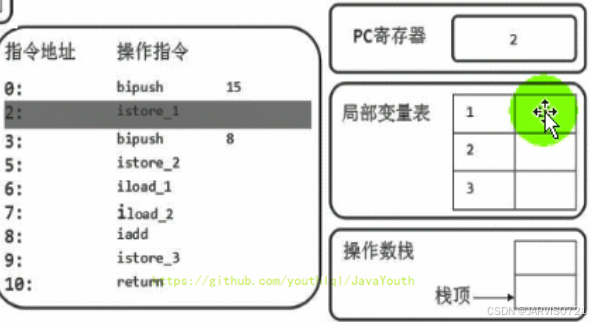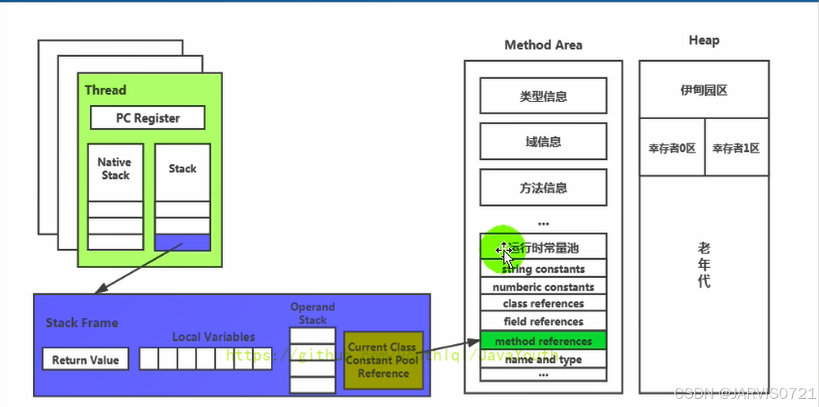 - 指向运行时常量池(运行时常量池:类被加载JVM,class文件被加载到运行时常量池,存储字面量、符号引用、方法句柄、类引用;运行时常量池当中的字符串字面量存储在字符串常量池当中(JDK8之后字符串常量池在堆中))
