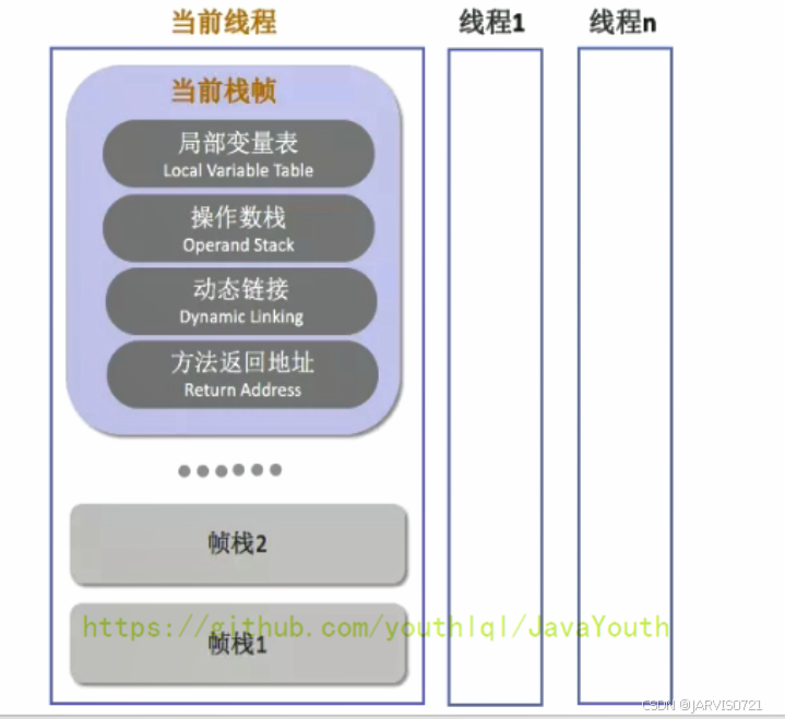 采用固定大小的Java虚拟机栈,每个线程的JVM栈都可以在线程创建的时候独立选定。线程执行过程当中,方法调用层级过深/需要栈帧总量超过栈容量,JVM将抛出StackOverFlowError异常