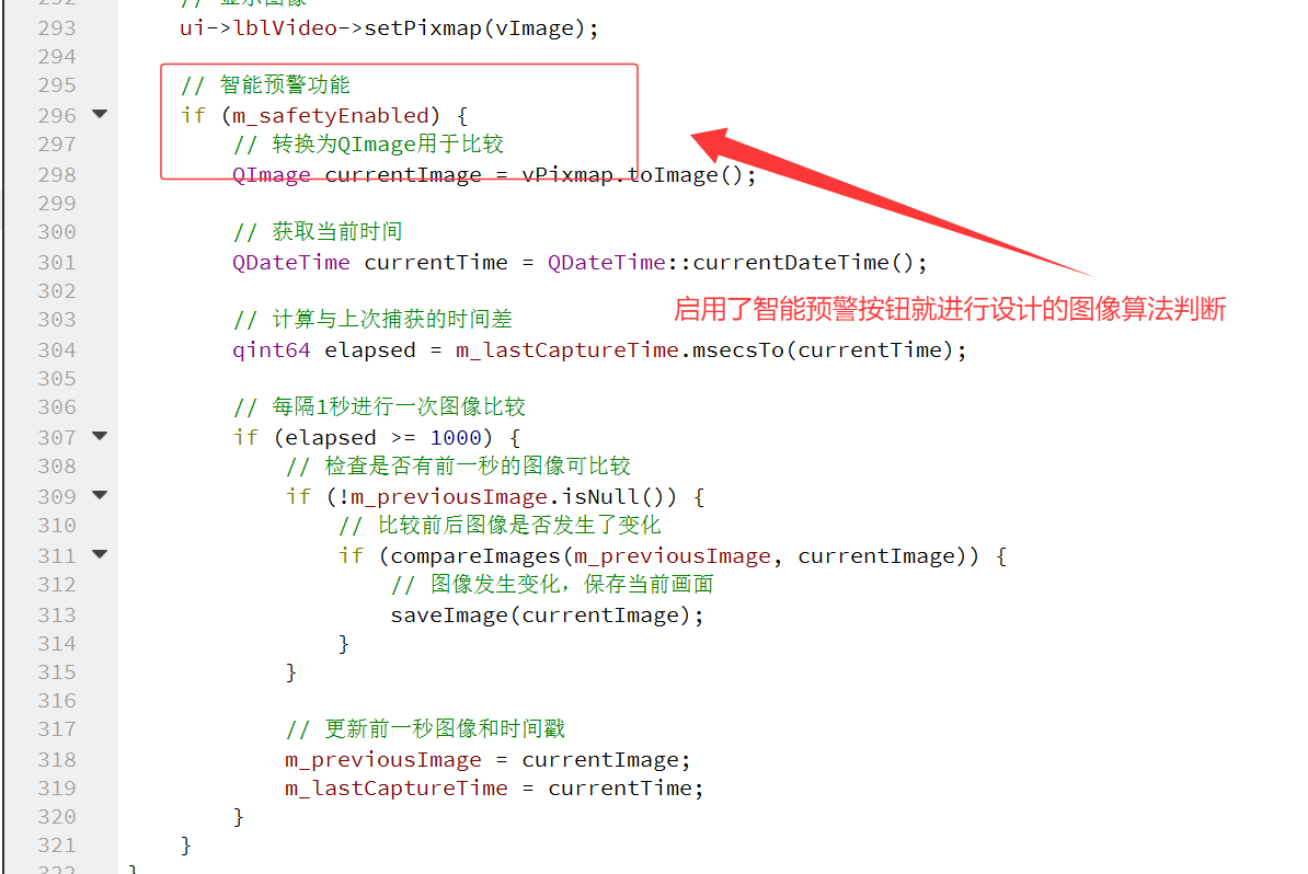 QMessageBox::information(this, "提示", "智能预警功能已启用\n当检测到图像变化时,会自动保存画面到桌面的'ikun ESP32 Camera'文件夹");