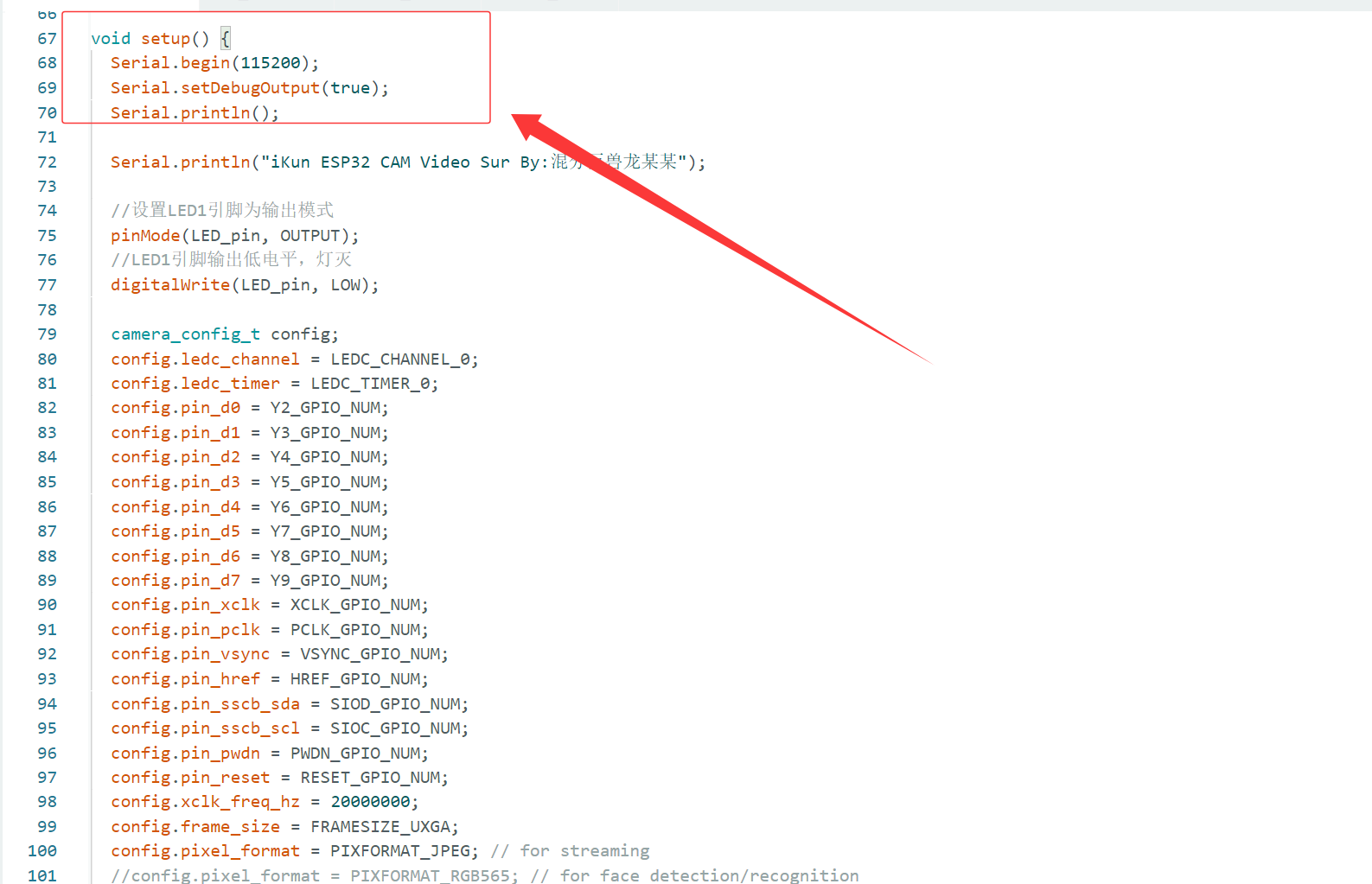 乐鑫官方提供的 ESP32_CAM 例程代码核心就是 setup() 函数,包括:WIFI Camera 的 GPIO 引脚配置、摄像头的视频流格式、摄像头的数据格式初始化设置和 WIFI 连接等