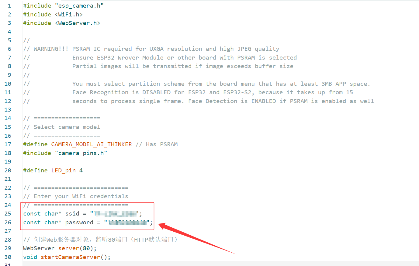 const char* password = "13852200640"; ESP32_CAM 连接的 WIFI 密码