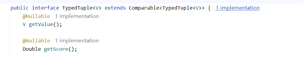 Set<ZSetOperations.TypedTuple<String>> typedTuples = stringRedisTemplate.opsForZSet().reverseRangeByScoreWithScores(key, 0, max, offset, 2);我们带了分数,所以返回的应该也带有分数,函数返回的是ZSetOperations.TypedTuple<String>,很复杂,其实就是一个元组,里面就是有值和那个分数,你看源码:得到直接调用这两个方法即可。