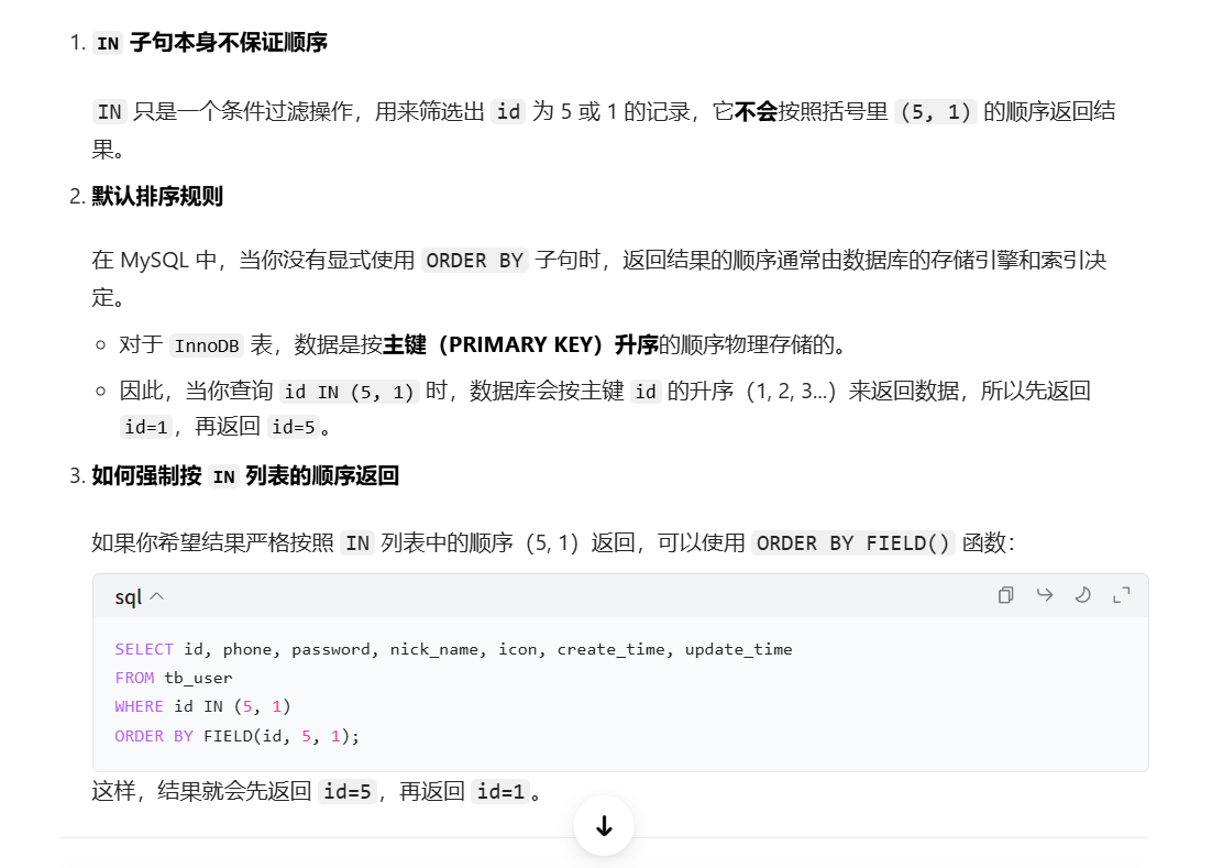 为什么返回的是从后到前呢?这是因为id in (),给的是从前到后,但是实际查询的其实是按照主键排序的,in只是起到一个升序的作用