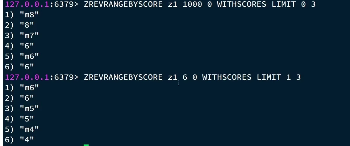比如这个第一页是m8,m7,m6,然后你就去写zrevrangebyscore z1 6 0 limit 1 3是不对的