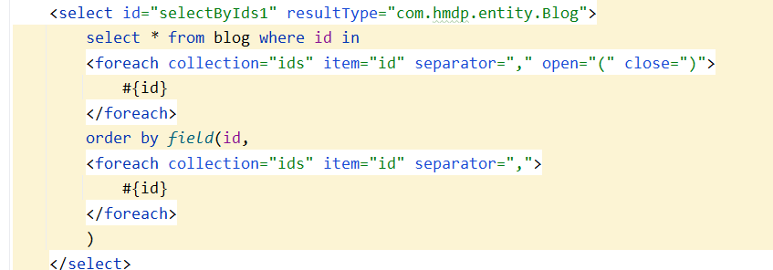 XML<select id="selectBatchIds1" resultType="com.hmdp.entity.User"> select * from tb_user where id in <foreach item="id" collection="collect" separator="," open="(" close=")"> #{id} </foreach> order by field(id, <foreach item="id" collection="collect" separator="," open="(" close=")"> #{id} </foreach> ) </select>