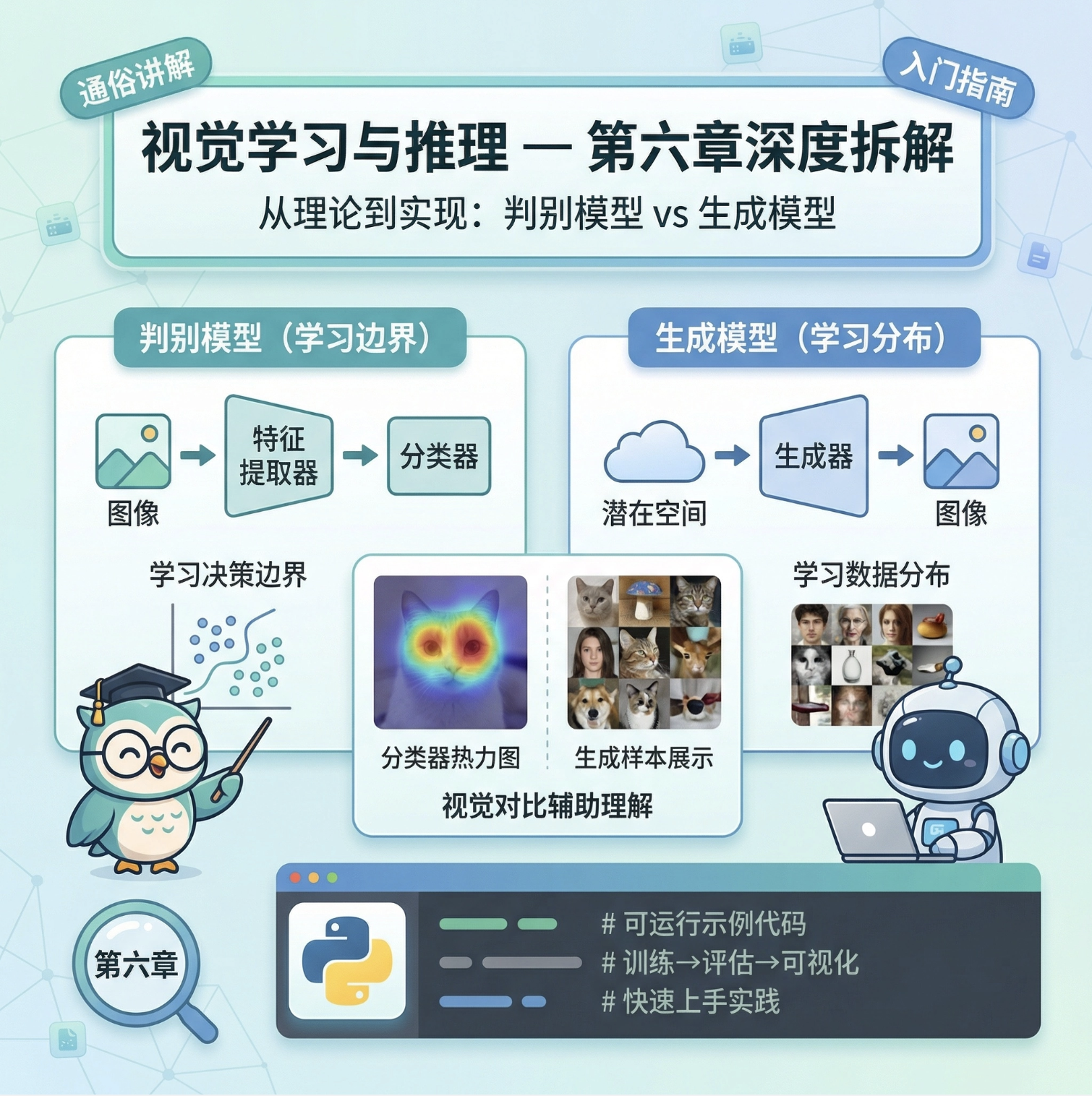 大家好!今天我们来深度拆解《计算机视觉:模型、学习和推理》这本书的第 6 章 ------ 视觉学习和推理。这一章是计算机视觉从 "理论" 走向 "落地" 的核心,很多新手会被 "判别模型"" 生成模型 " 这些概念绕晕,所以我会用最通俗的语言、结合可直接运行的 Python 代码和可视化对比图,帮你彻底搞懂这些核心知识点。