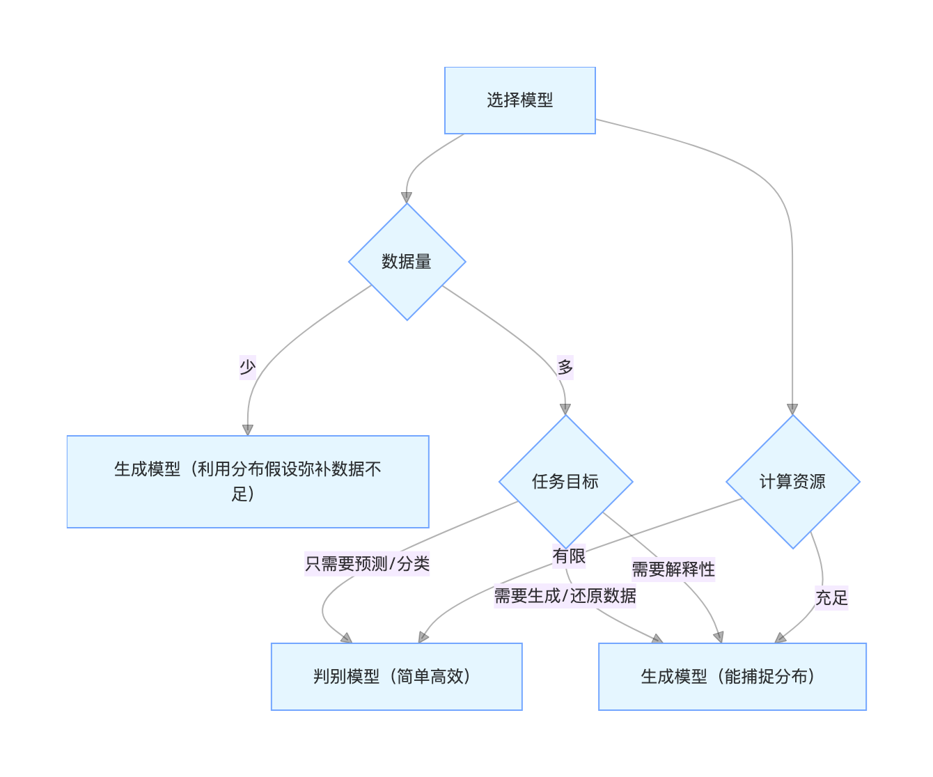3.模型选择:数据少 / 需生成→生成模型,数据多 / 仅预测→判别模型;